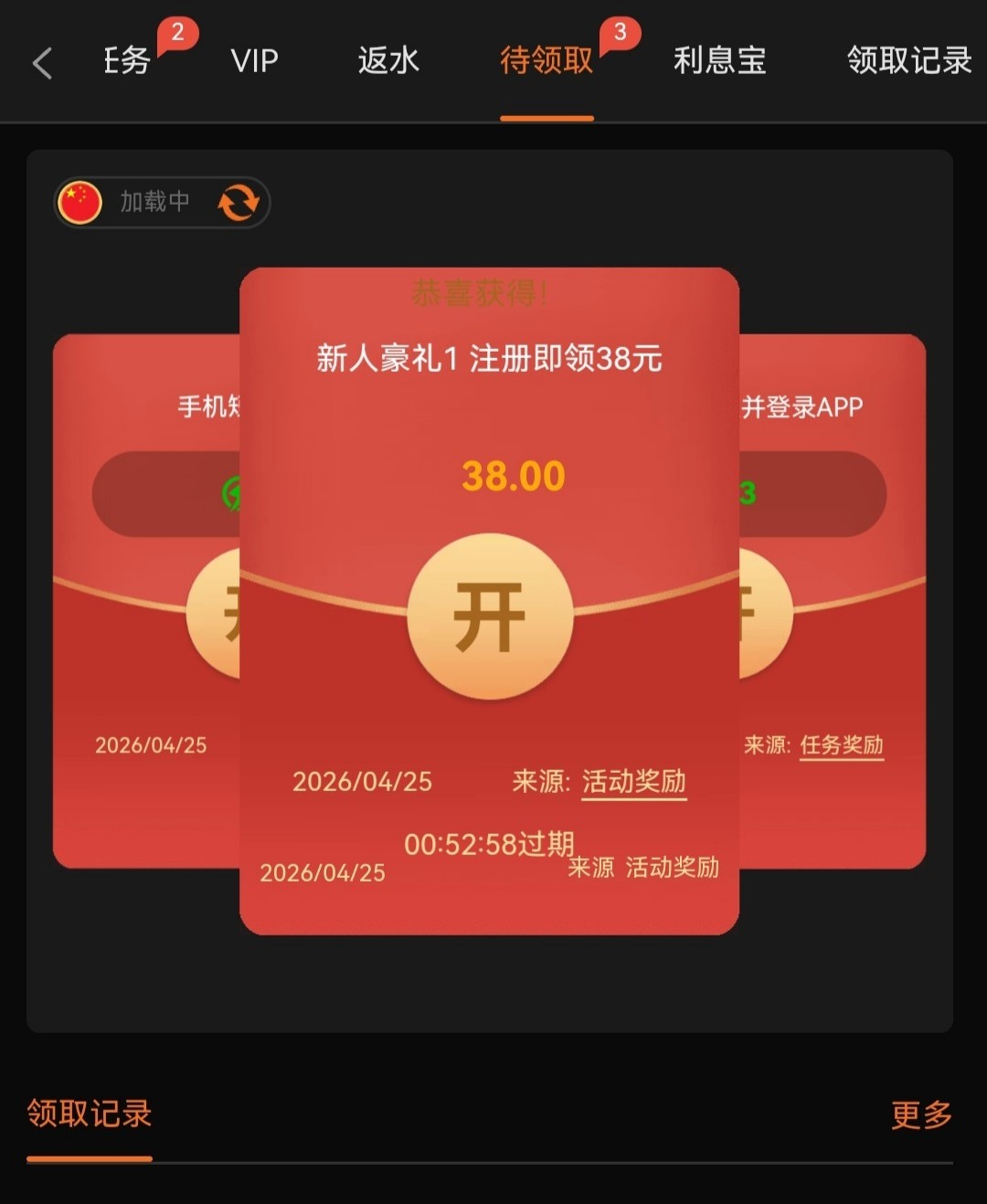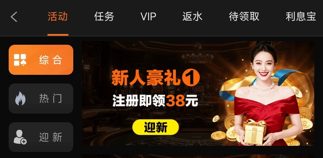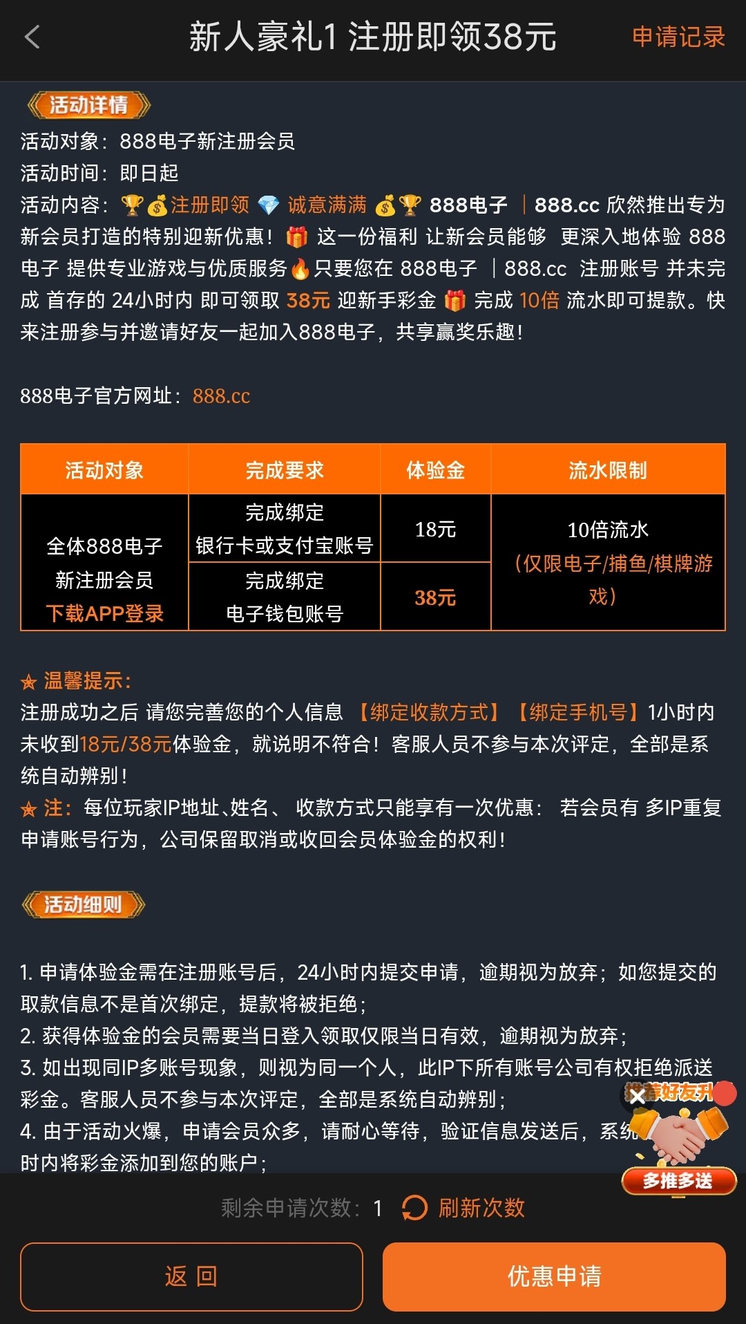 注册后在优惠里找到“新人豪礼1”在里申请彩金,需要下载APP登入,绑定支付宝和银行卡只有18彩金,绑定电子钱包有38彩金二选一,10倍流水,仅限电子捕鱼棋牌