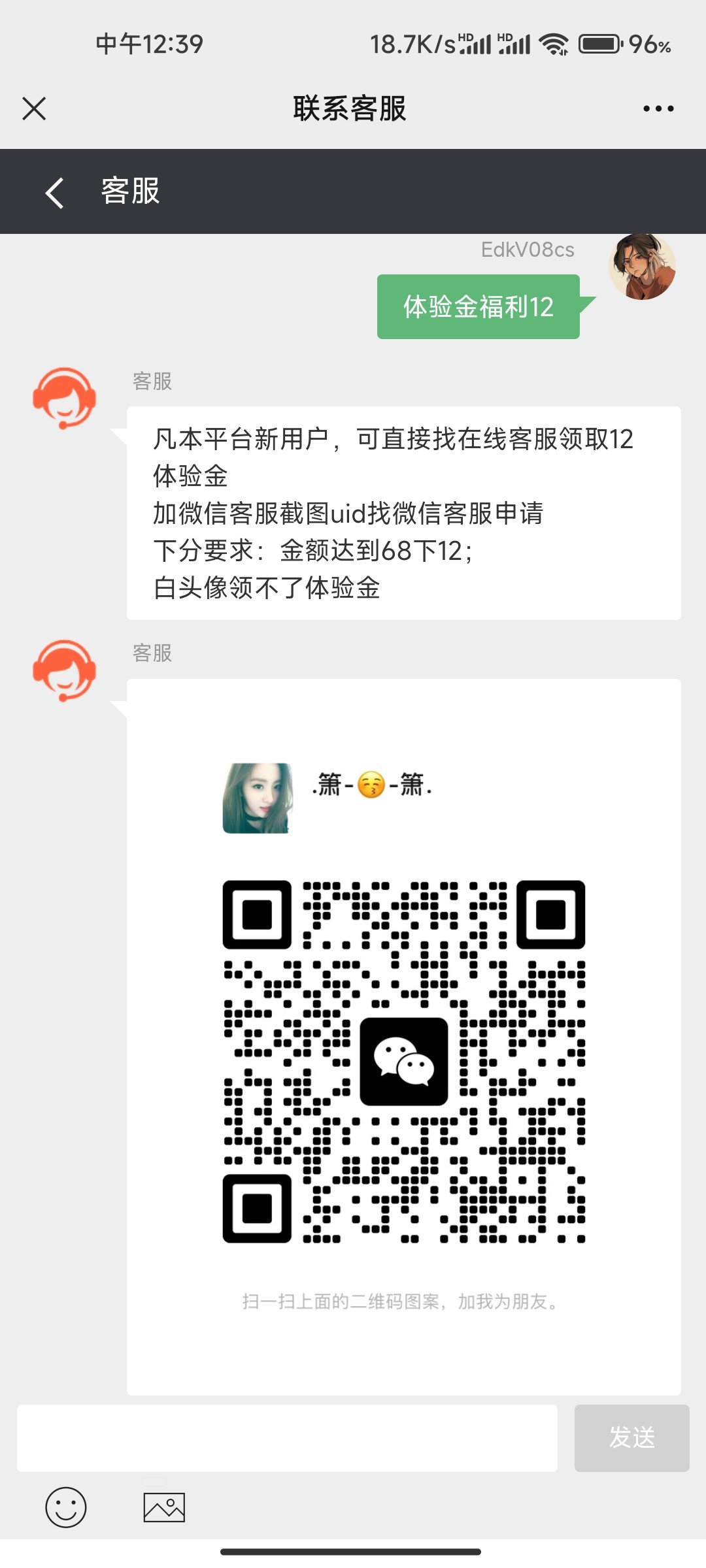 新用户微信扫码点击微信登录进去,然后联系在线客服添加体验金客服微信秒12/68提12元红包,找客服兑换即可