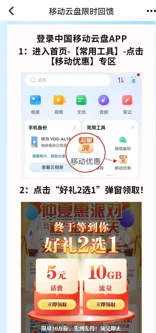 登陆中国移动云盘APP,首页-常用工具-移动优惠,5元话费或10GB流量2选1(限地区可见,如广东)