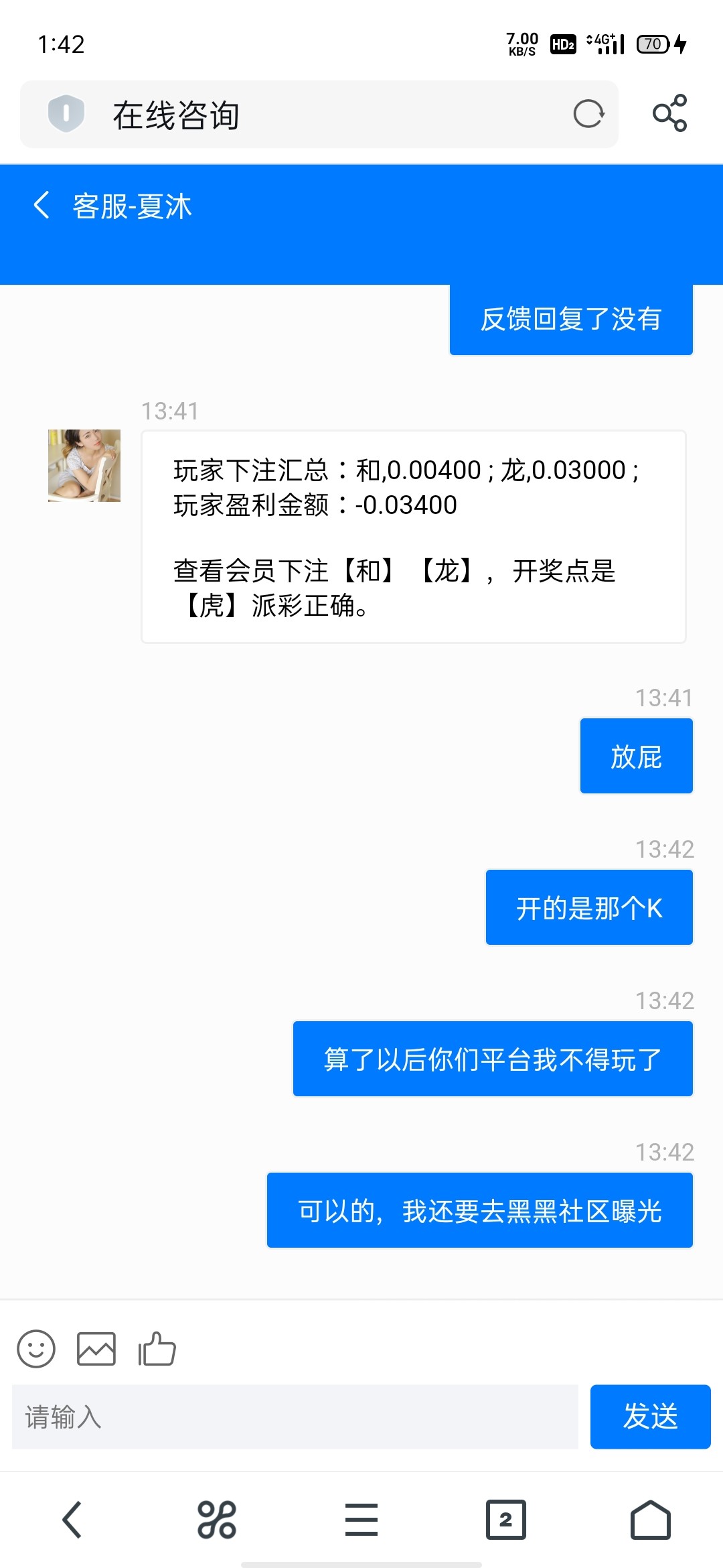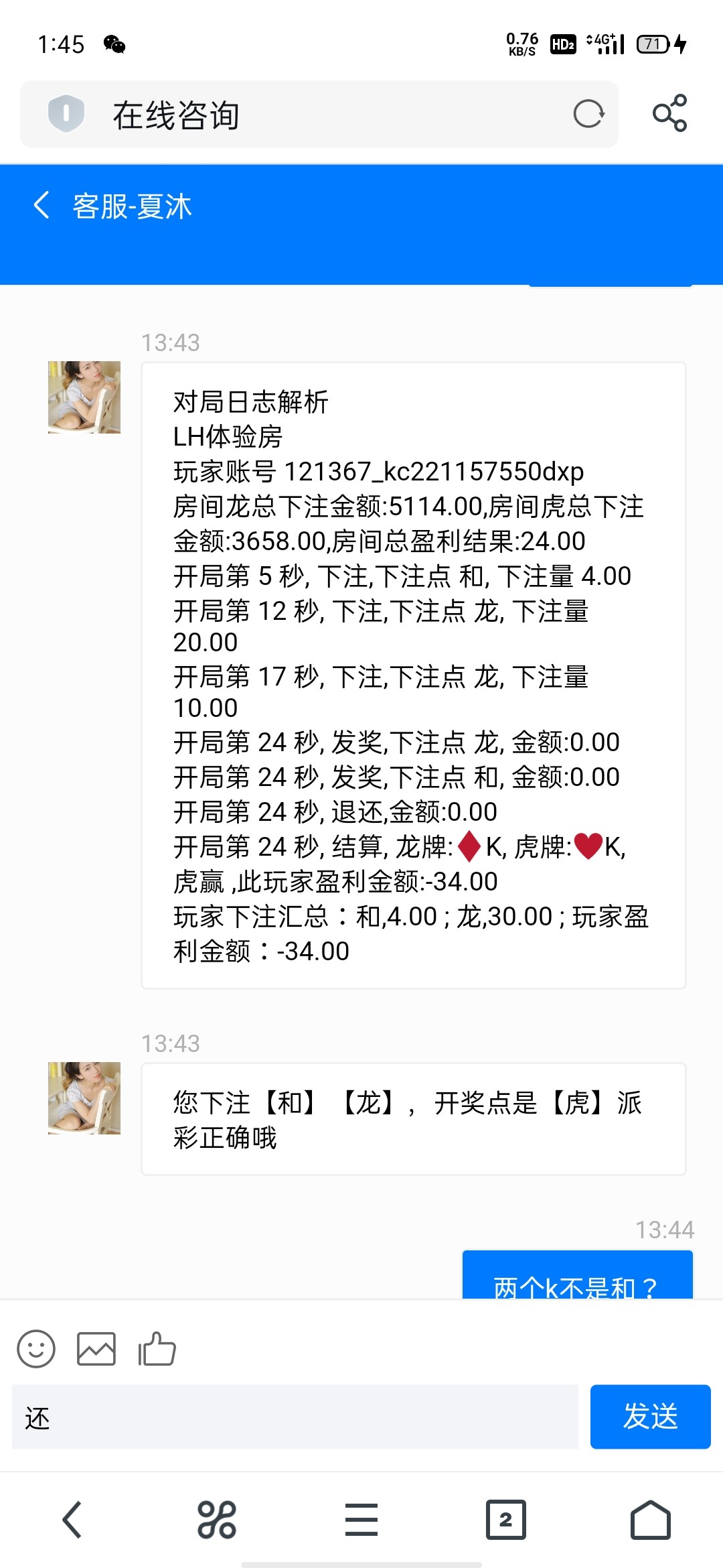 黑平台,一伙的,开两个K,结果判定给虎赢,我压了,龙和,两个k,结果虎赢,反正我露露嘘嘘开元输了2400,压那个那个输