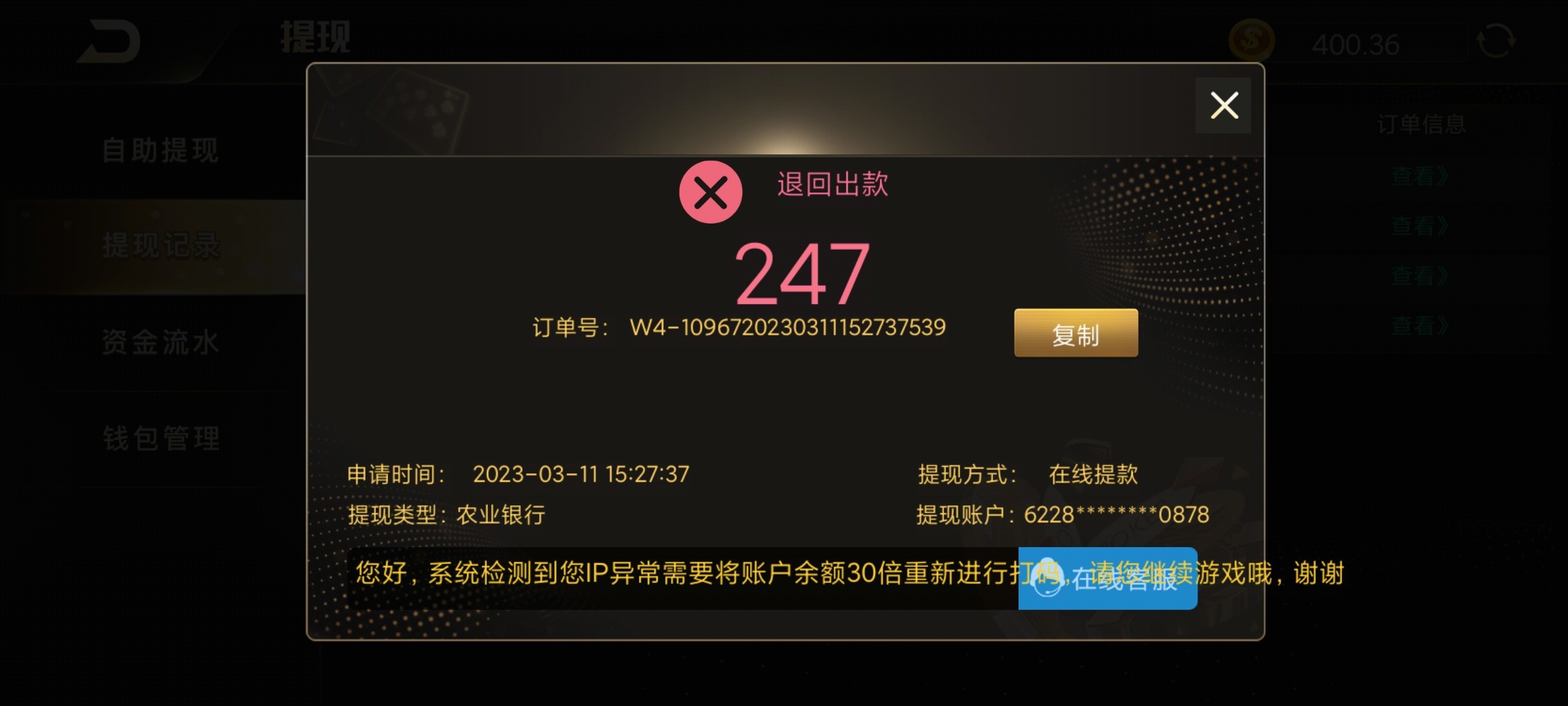 充值130,裸玩玩ag然后提现247退回➕30倍流水,打完流水提399又➕30倍流水,后面要我冲300说解除风控,我冲了,然后打到900多提现封号,8195真是死了妈。