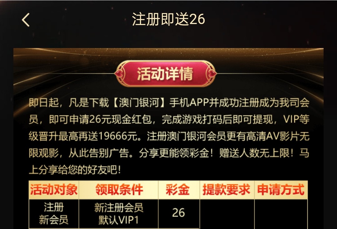 新用户注册可申请26彩金签到也可以申请彩金特邀碰瓷都可以去试试 游戏和提款限制自行查看优惠