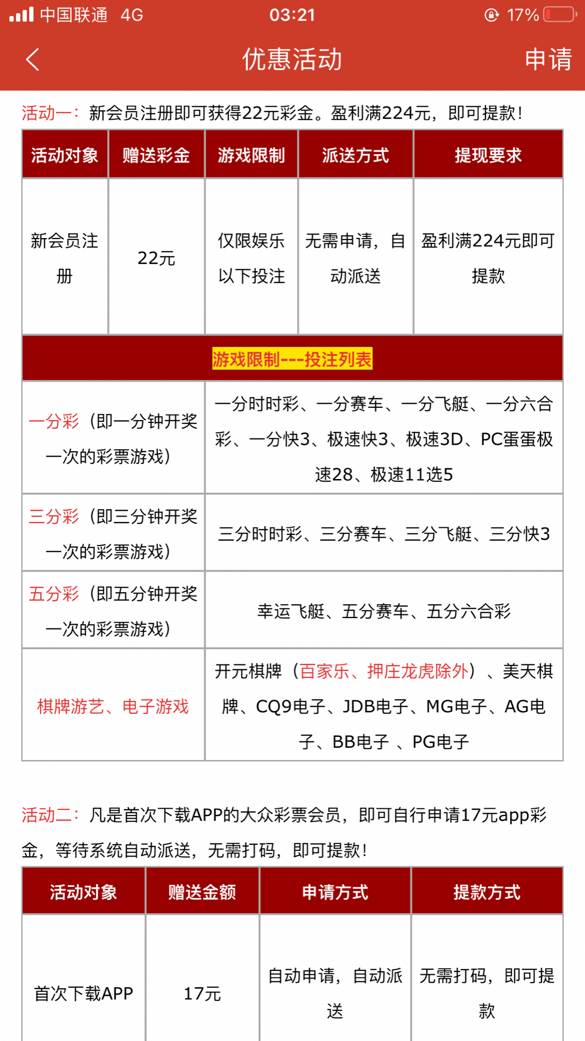 注册下载app绑定手机号、qq、银行卡,当天送22,优惠里申请17下载彩金,亲测17秒到,图片自行查看游戏提款限制