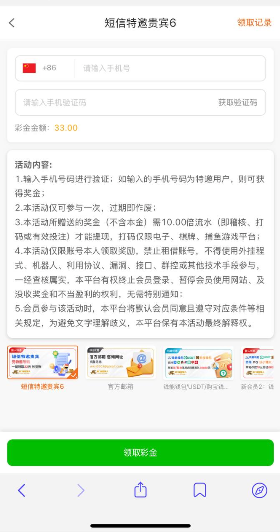 下载app注册完善信息,优惠活动里面找到活动输入手机号自助领取33彩金,注意必须要下载app注册,不是特邀用户的还有一个下载app彩金。