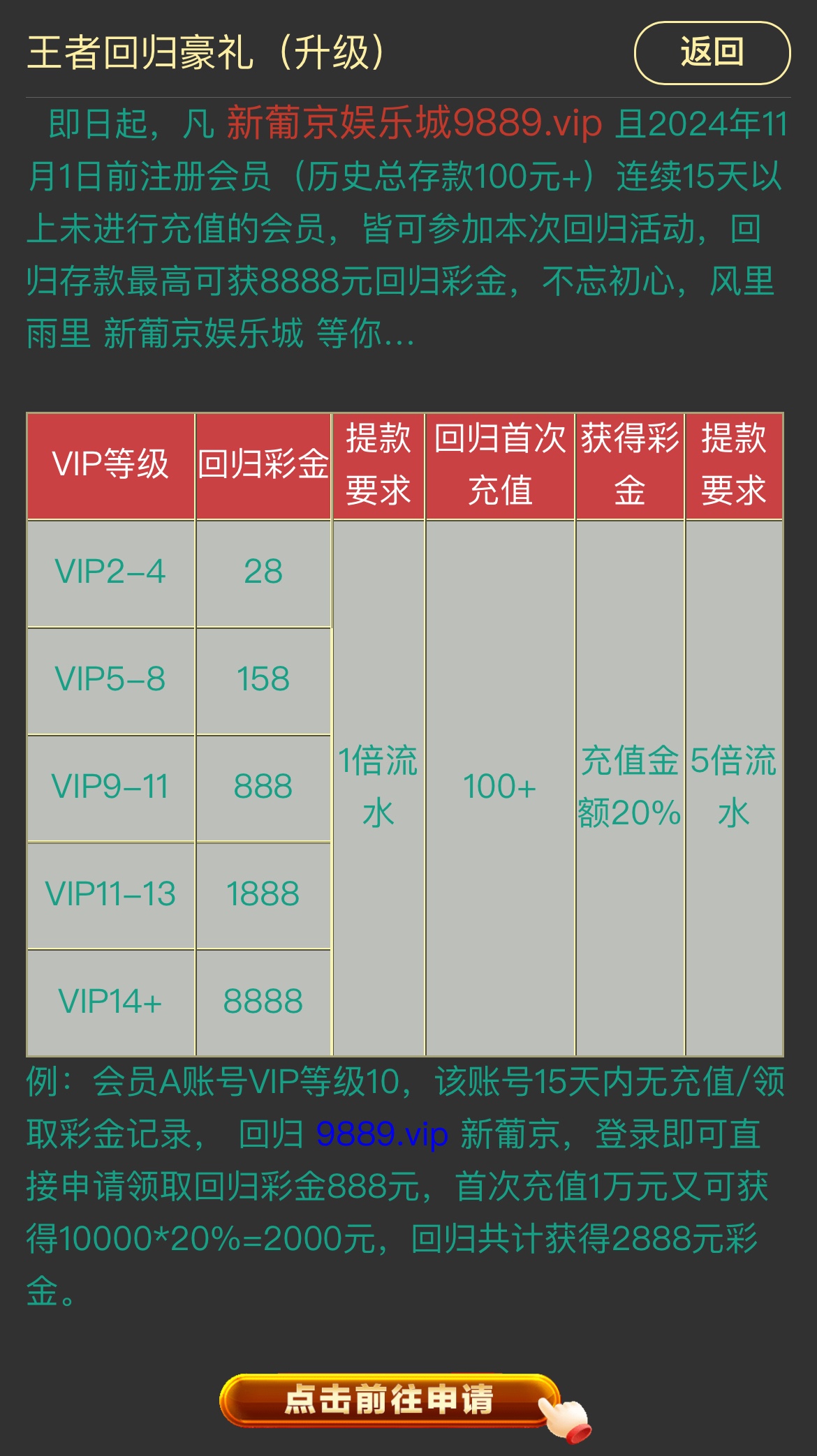 历史回归在去年11月1号前注册历史存款有100以上的按VIP等级领取彩金,一倍流水,自助申请