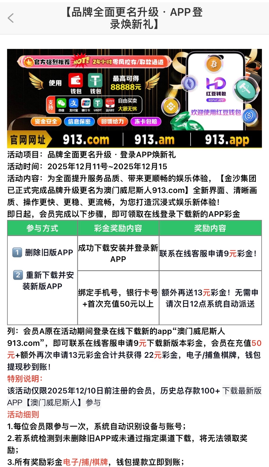 金沙集团913合并到威尼斯人913了有号充值过100以上可以去领取一下