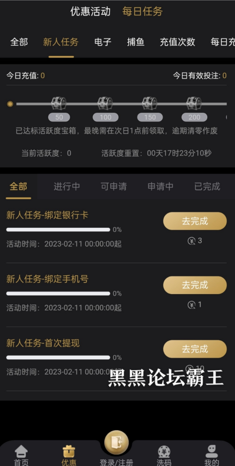 新用户手机号注册,优惠,每日任务里面完善资料自助领取4彩金,最低100即可提现,出款情况自测
