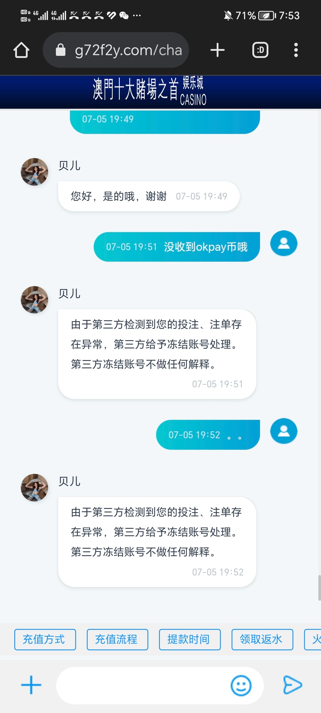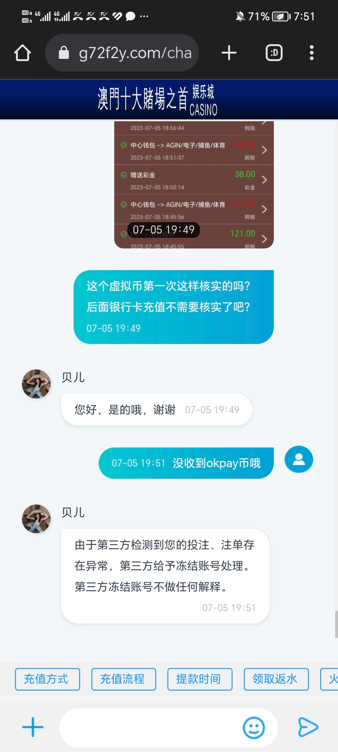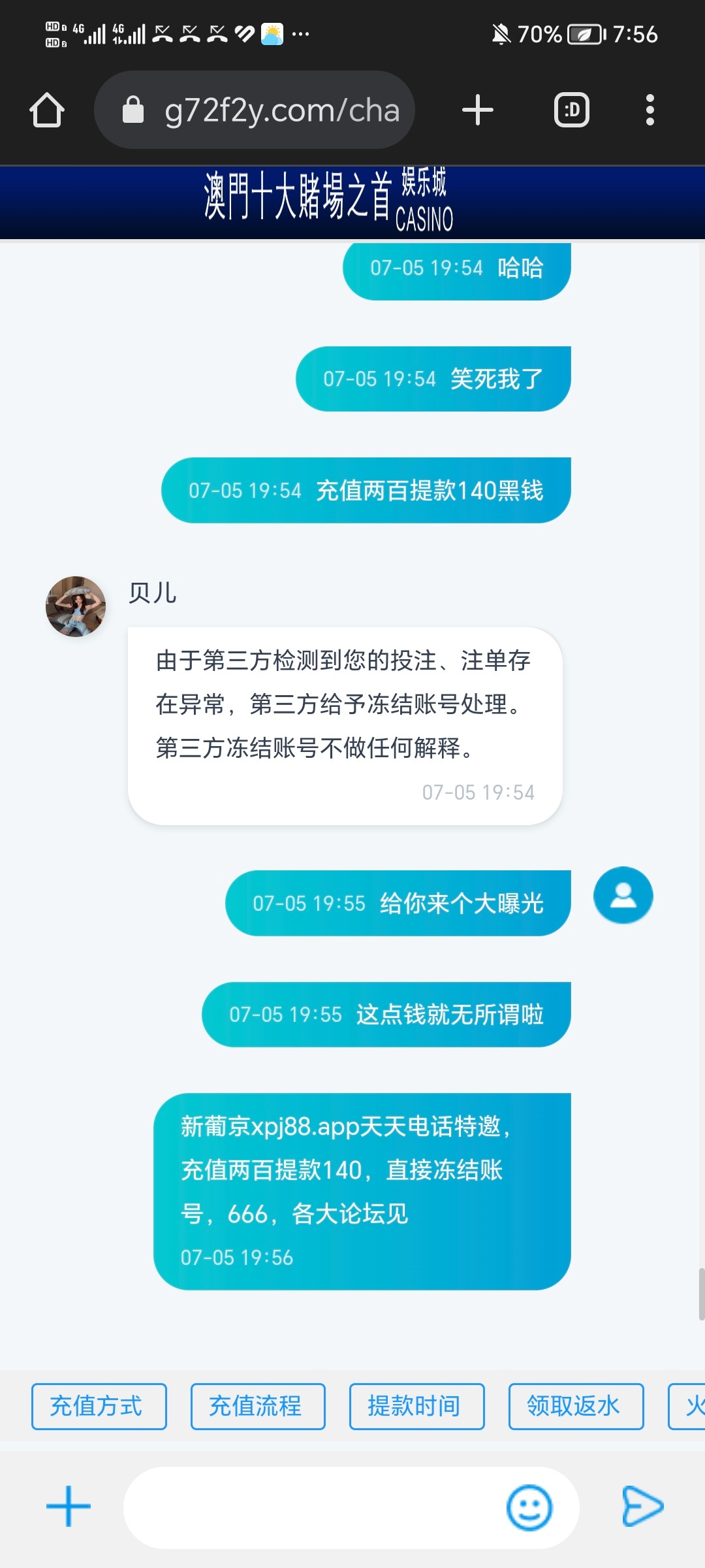 你们看看这个平台多么的黑啊,简直黑的不要脸,充值200提款140,打电话过来核实,核实完了问要不要做代理,我说不要,挂电话直接登录账号修改取款和登录密码,直接封号,黑黑