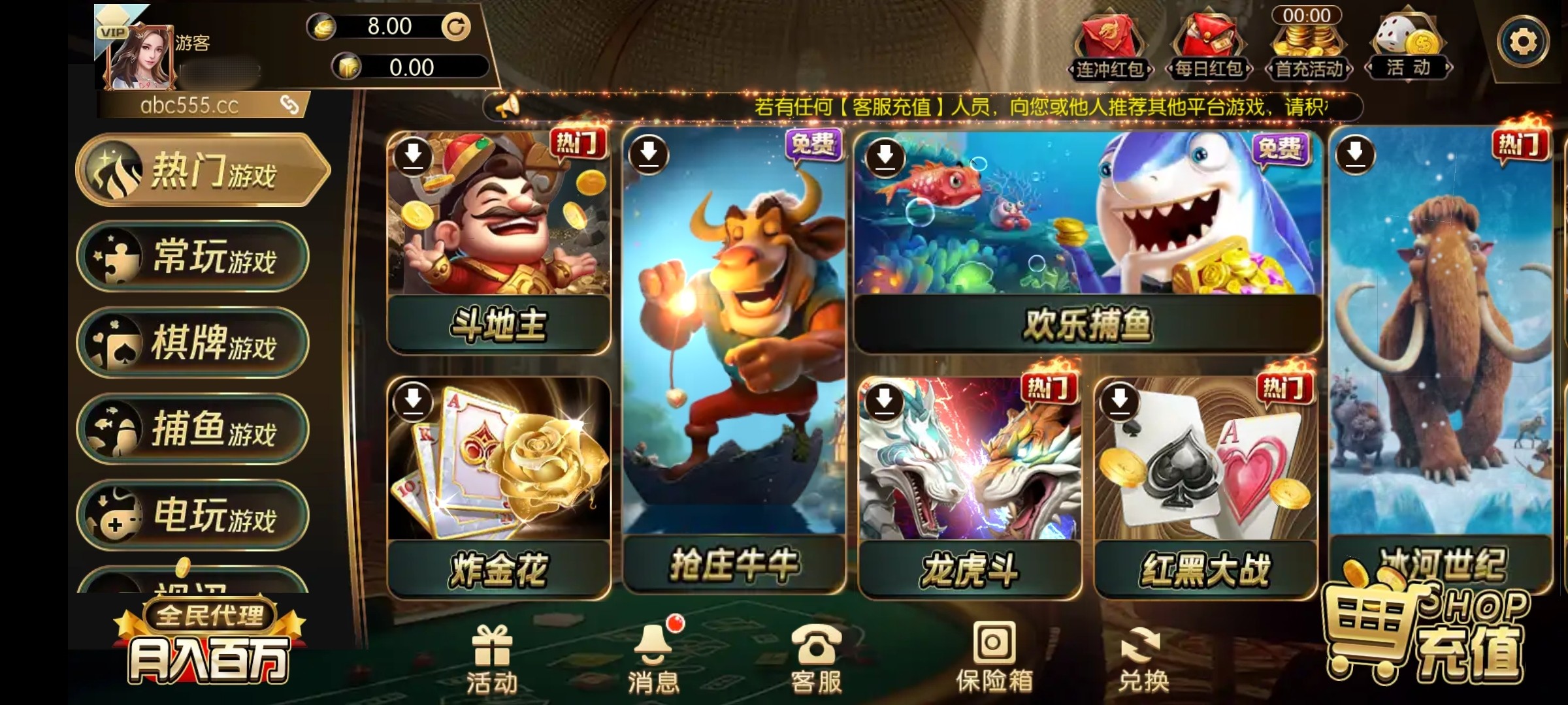 刚出来的平台 新用户下载app游客登陆绑定手机号秒送8-38 先玩棋牌 打到50就可以玩其他游戏了 最低提款100元 我朋友碰到了38我秒8