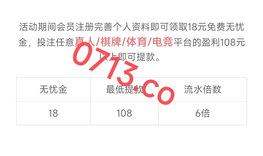 新用户注册绑卡完善信息两小时内派送18彩金,最低108提,每天500名额,6倍流水,限真人/棋牌/电竞/体育